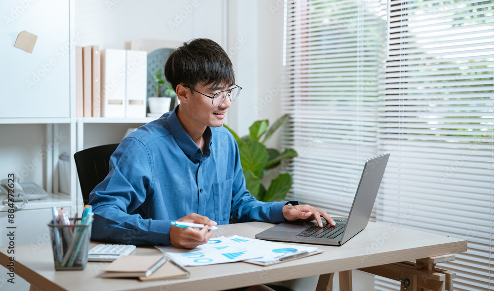 document, freelance, ethnicity, job, manager, occupation, study, working, writing, worker. A man is sitting at a desk with a laptop and a stack of papers. He is smiling and he is enjoying his work.