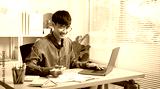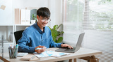 document, freelance, ethnicity, job, manager, occupation, study, working, writing, worker. A man is sitting at a desk with a laptop and a stack of papers. He is smiling and he is enjoying his work.