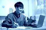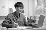 document, horizontal, job, manager, occupation, paperwork, plan, worker, education, office. A young man is sitting at a desk with a laptop and a pen. He is smiling and he is happy.
