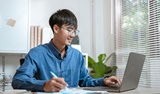 freelance, homework, job, learning, manager, note, studying, working, writing, finance. A man is sitting at a desk with a laptop and a pen. He is smiling and he is happy.
