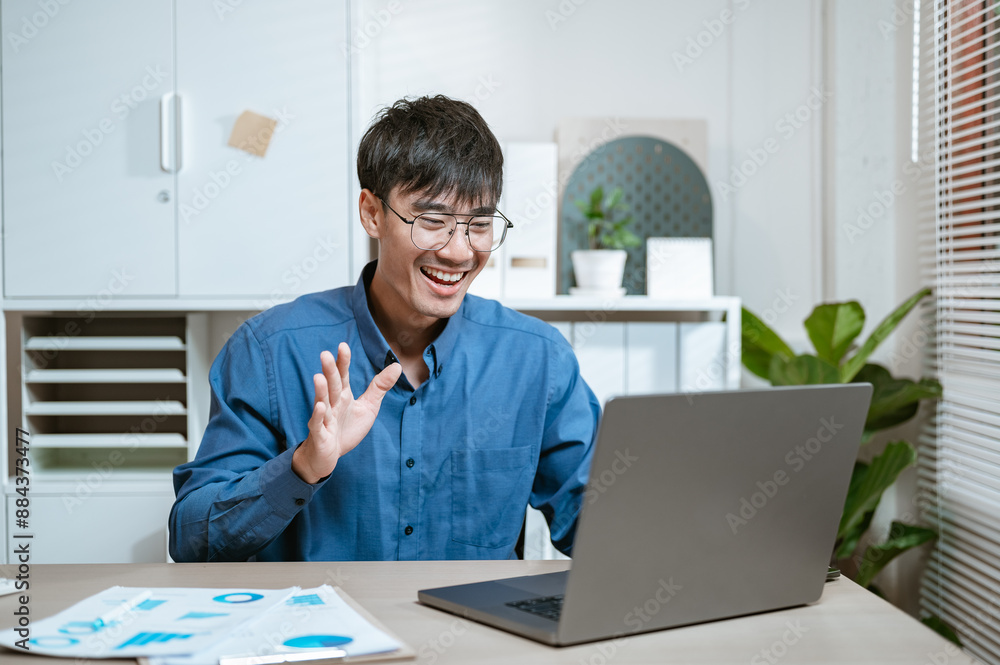 conference, freelance, job, manager, study, working, education, student, smiling, corporate. A man is smiling and waving at the camera while sitting at a desk with a laptop.