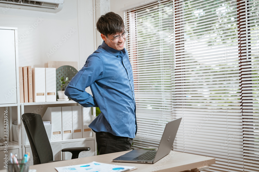 backache, executive, job, manager, missing, occupation, overworked, pain, papers, paperwork. A man in a blue shirt is hunched over a laptop computer. He is wearing glasses and he is in pain.