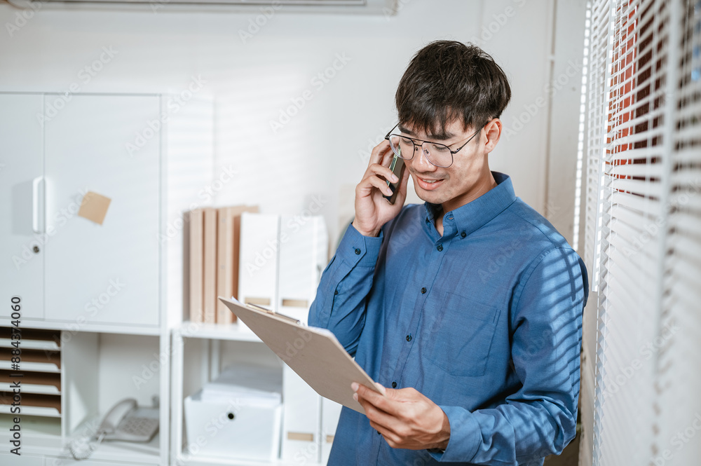 document, freelance, communication, executive, job, lawyer, manager, occupation, working, worker. A man is talking on his cell phone while reading a piece of paper. he is in a good mood.