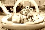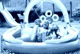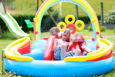Group of happy healthy kids having fun in inflatable play centre. Children enjoying summer holidays playing in the pool at the backyard in the garden.