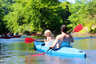 Father and son kayaking on the river. Active happy family, a man with teenage school boy, having fun together enjoying adventurous experience on a sunny day during summer vacation.