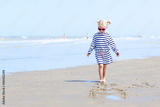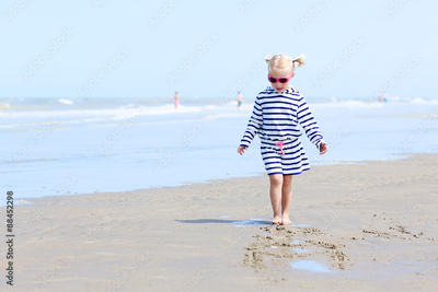Cute active child wearing pink sunglasses playing and running on wide sandy beach. Happy little girl enjoying summer holidays on a sunny day. Family with young kids on vacation at the North Sea coast.