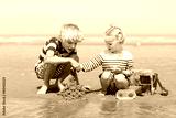 Two happy active children, teenage boy with his little sister, cute blonde toddler girl, playing with plastic toys building sand castles sitting on wide sandy North European beach