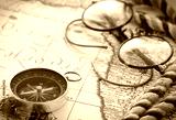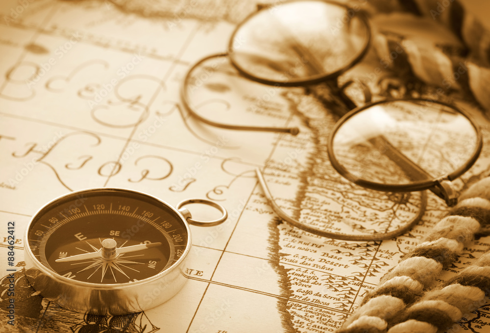 Compass and glasses on vintage map