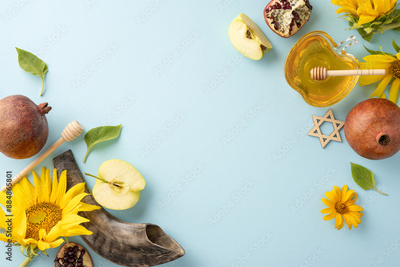 Traditional Rosh Hashanah table setting featuring honey, apples, pomegranates, shofar, and star of David elements on a light blue background