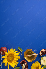 Rosh Hashanah festive vertical arrangement with honey, apples, pomegranate, and sunflowers on a blue background