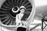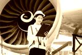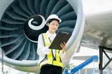 Female aviation engineer in safety gear inspecting an airplane engine, embodying professionalism and industry standards.