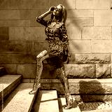 Sexy blonde model in fashionable leopard dress and golden knee boots is sensually walking in the city on a sunny summer day. Outdoor shoot.
