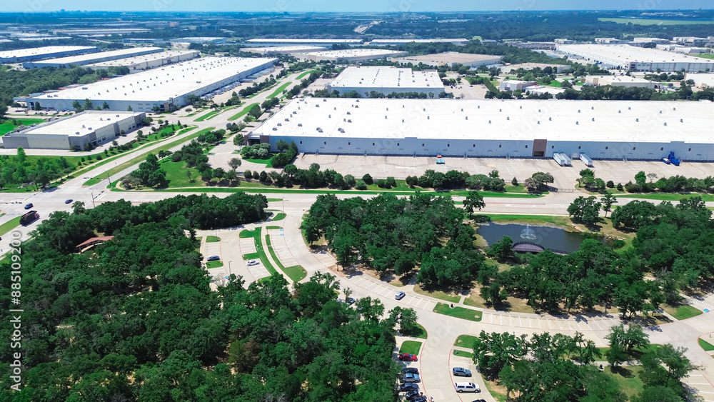 Aerial view large logistics center complex modern warehouse, busy shipping container load unload semi-trailer truck, industrial zone on suburb of Flower Mound, Dallas Fort Worth metroplex, Texas
