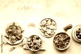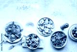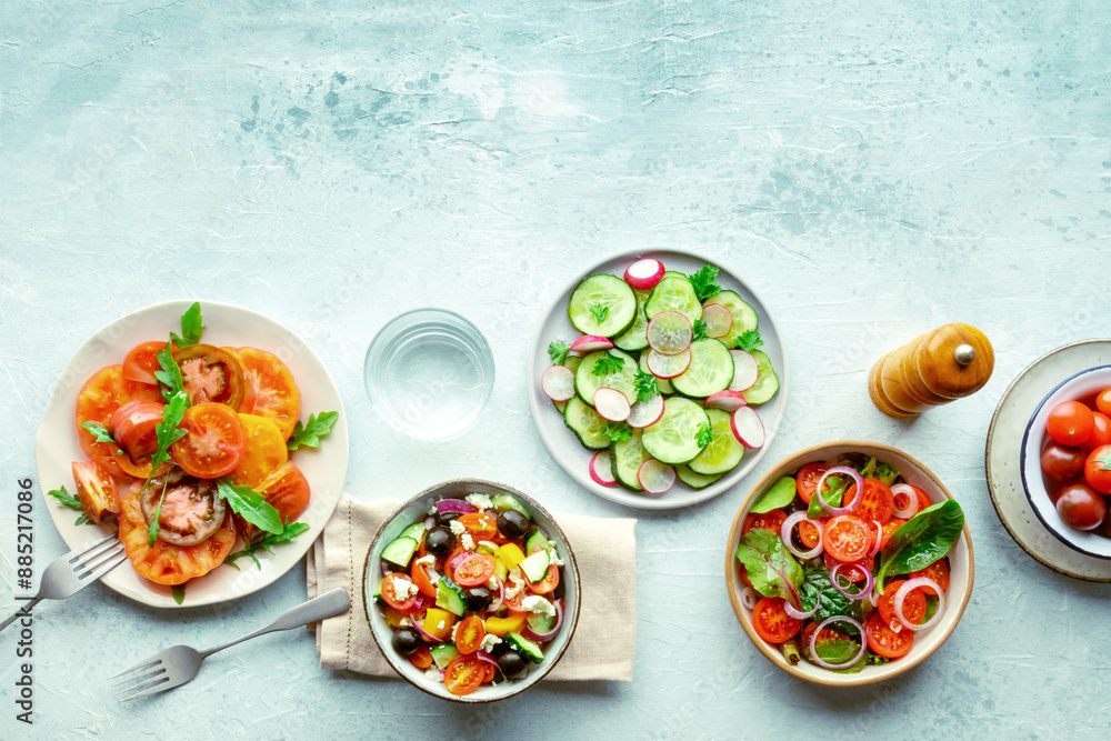 Fresh vegetarian salads, overhead flat lay shot of an assortment. Variety of plates and bowls with green vegetables. Healthy food, with copy space