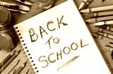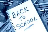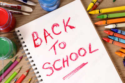 Back to school word writing written on open notebook book student desk surrounded by pencils and crayons photo