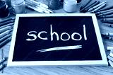 The word school written on a small blackboard on a child student desk with crayons and pencils photo
