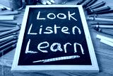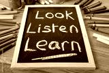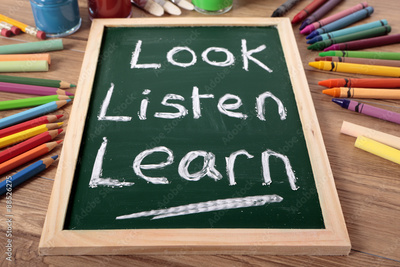 Look listen learn word writing written on a small chalk blackboard on a student desk surrounded by pencils and crayons photo