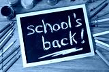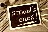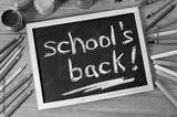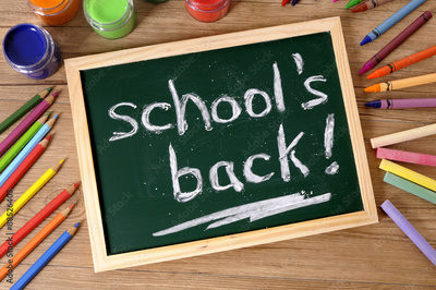 School's back for back to school written on a small blackboard on a child student desk with crayons and pencils photo