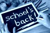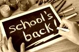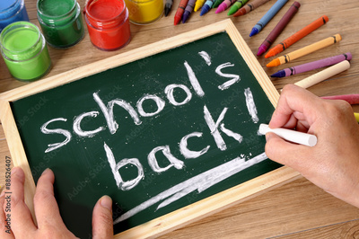 School's back for back to school written on a small blackboard on a child student desk with crayons and pencils photo