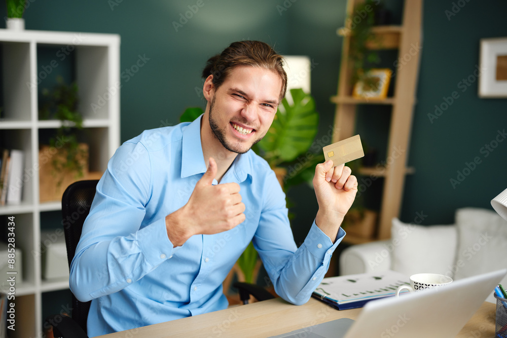Portrait of young man sitting at a table with a laptop in front of him and holds a credit card in his hand