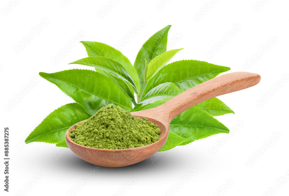 matcha green tea powder in wood spoon with tea leaf isolated on transparent png