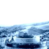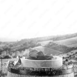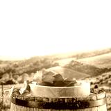 Empty top of old wooden wine barrel on a vineyard in the countryside. Copy space for food and drink and decoration or products.