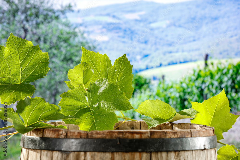 Empty top of old wooden wine barrel on a vineyard in the countryside. Copy space for food and drink and decoration or products.