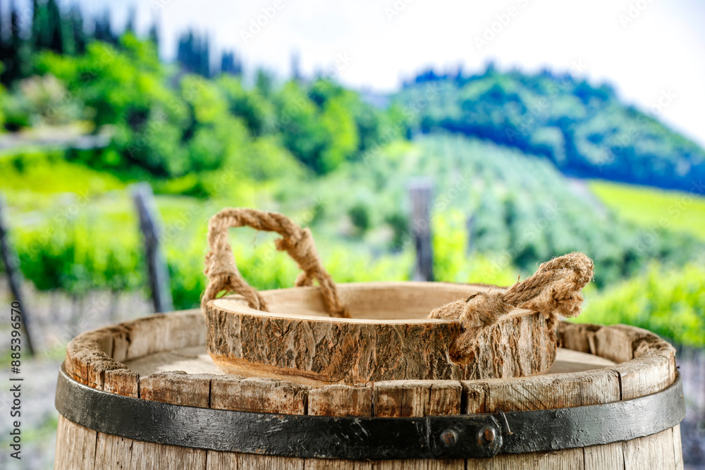 Empty top of old wooden wine barrel on a vineyard in the countryside. Copy space for food and drink and decoration or products.