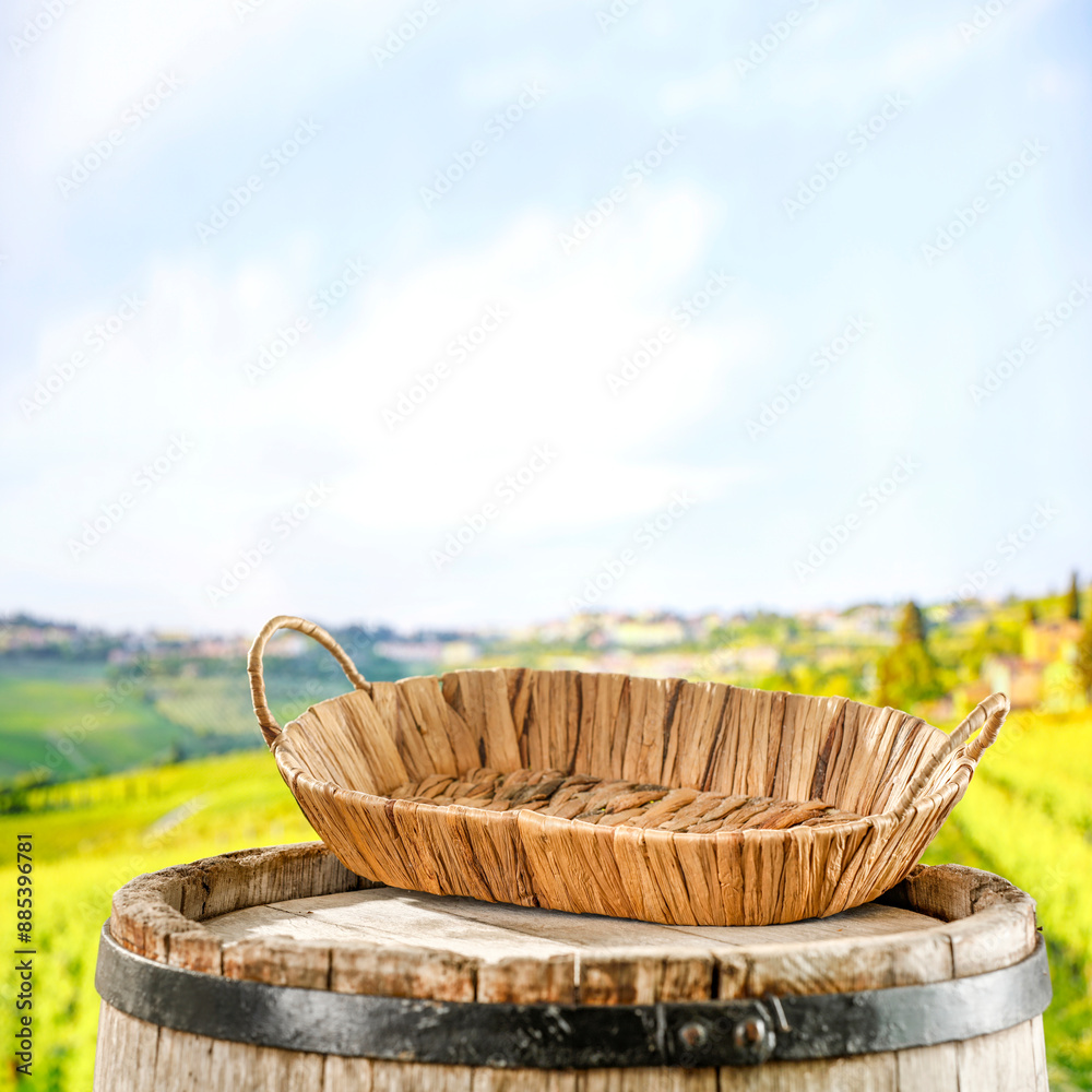 Empty top of old wooden wine barrel on a vineyard in the countryside. Copy space for food and drink and decoration or products.