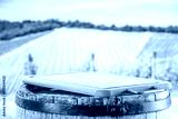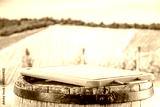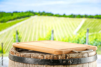 Empty top of old wooden wine barrel on a vineyard in the countryside. Copy space for food and drink and decoration or products.