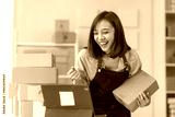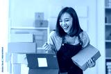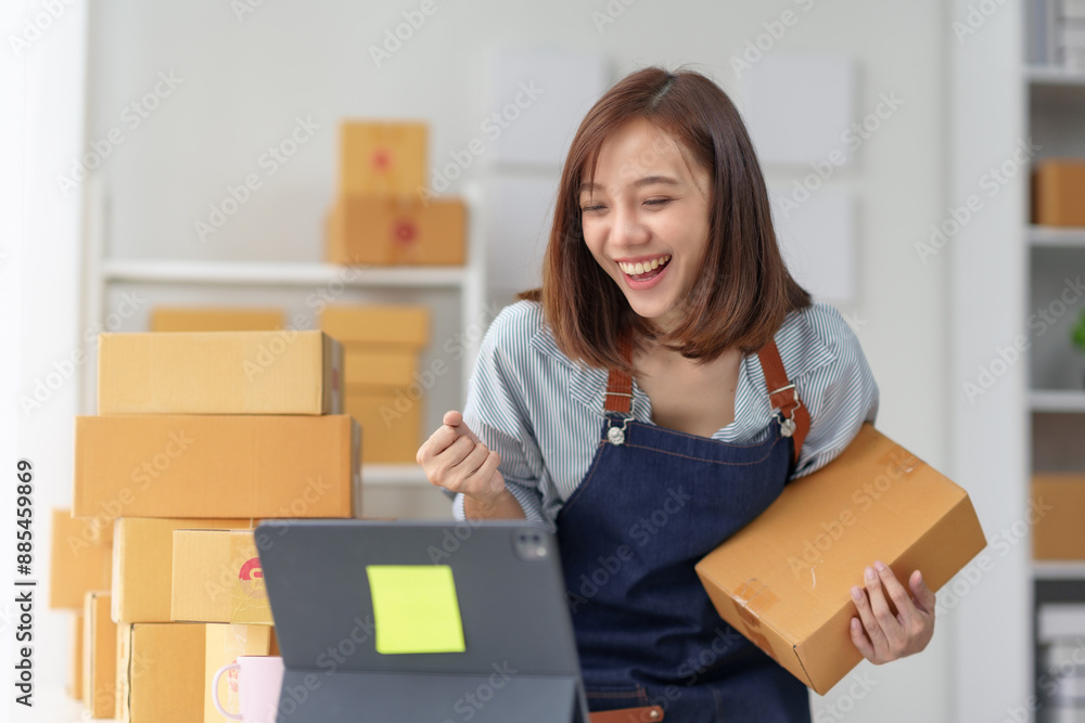 Smiling woman in apron holding box and working on laptop, surrounded by packages in a home office setting, representing successful small business.