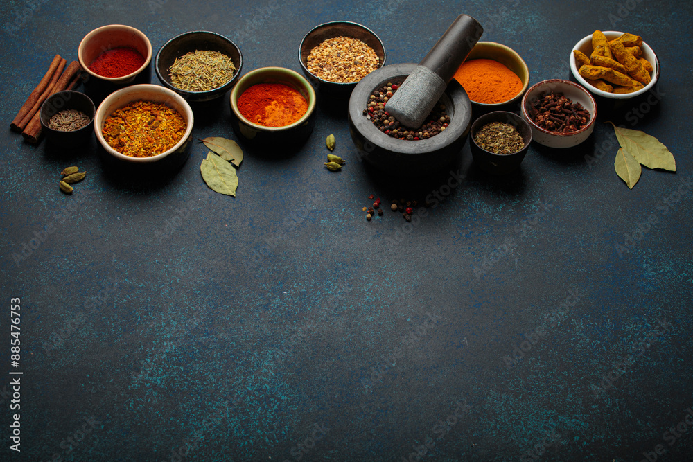 Colorful bowls of aromatic spices and herbs on a dark background, with a mortar and pestle, creating a border. Top view of flavorful ingredients for gourmet cuisine, offering copy space