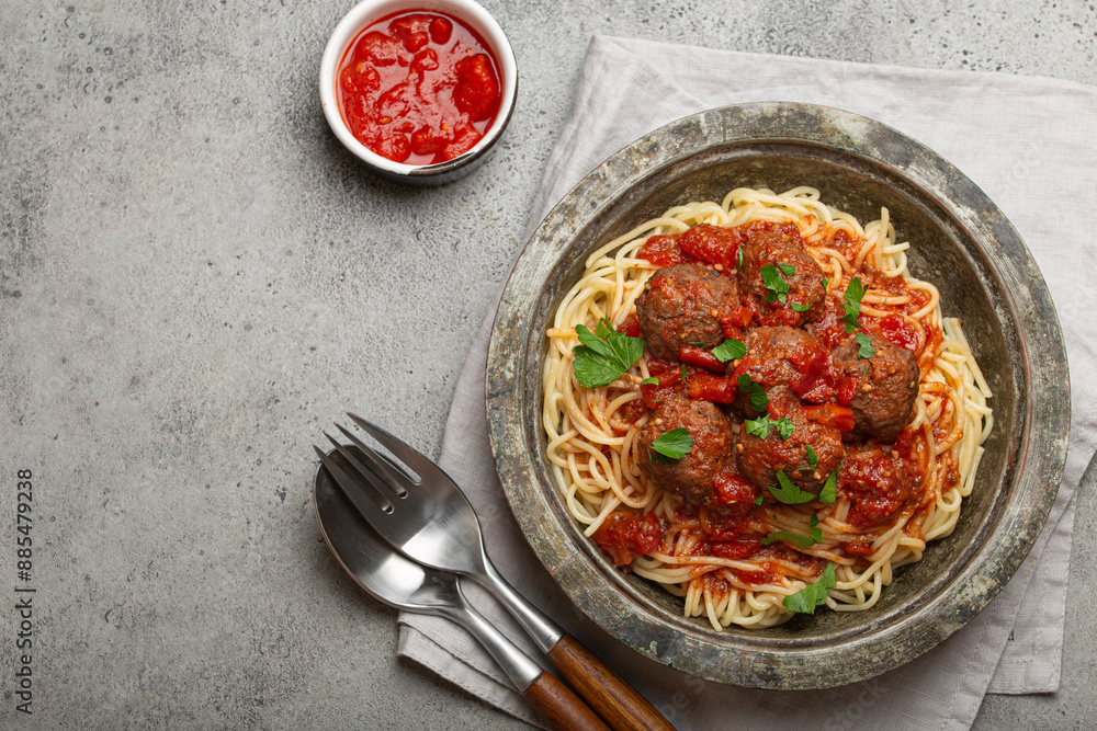 Spaghetti and meatballs with tomato sauce served on rustic plate with cutlery and tomato sauce on the side, on a gray background copy space