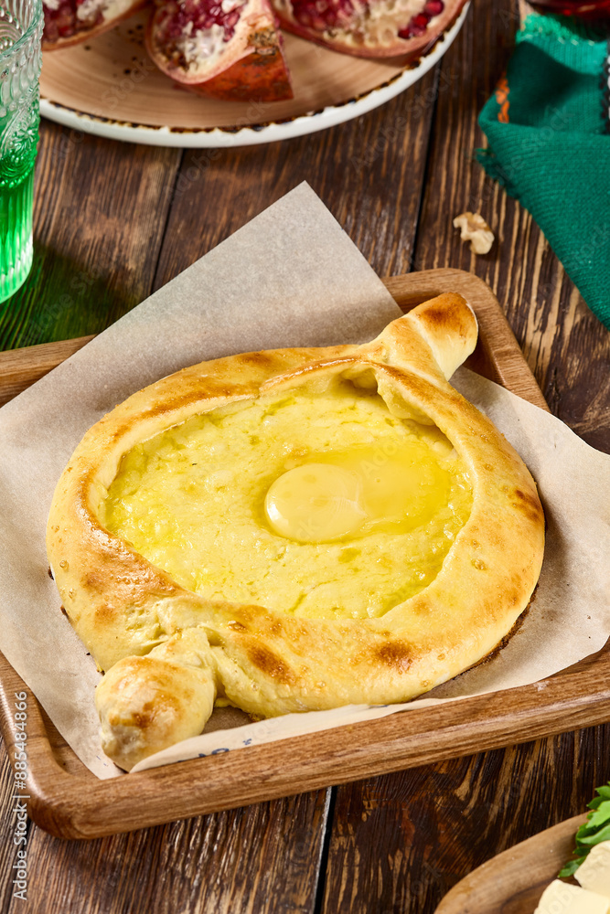 Traditional Adjarian Khachapuri with Egg on Wooden Plate
