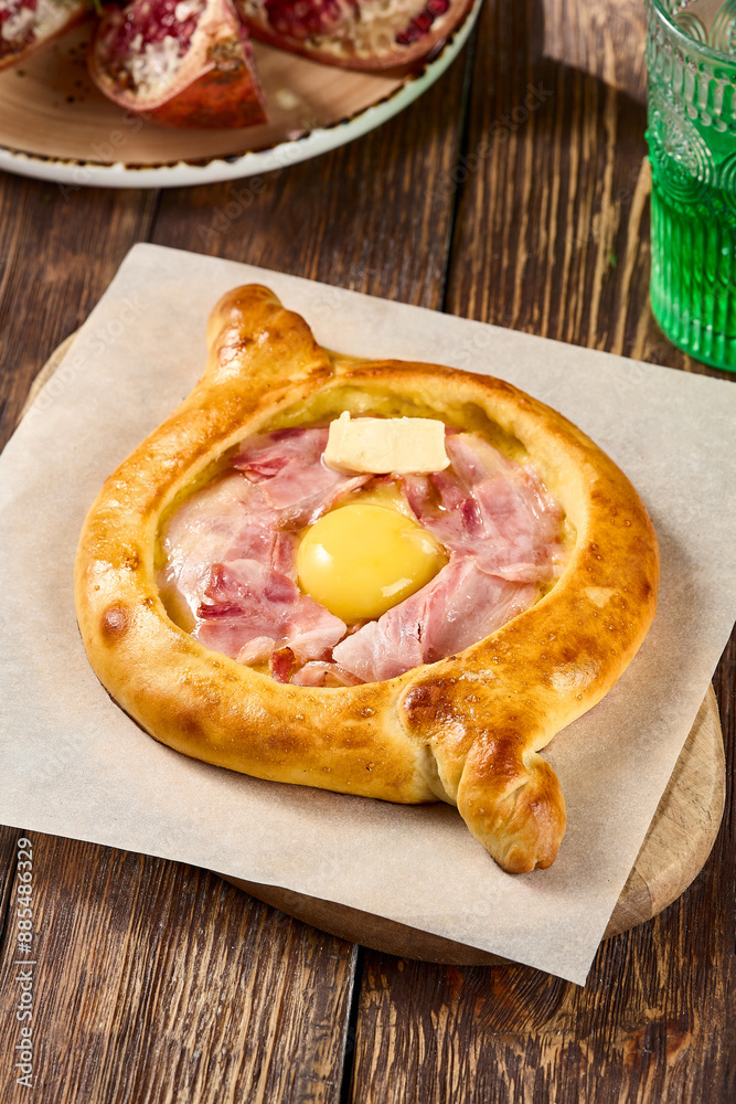 Traditional Adjarian Khachapuri with Bacon and Egg on Rustic Wooden Table