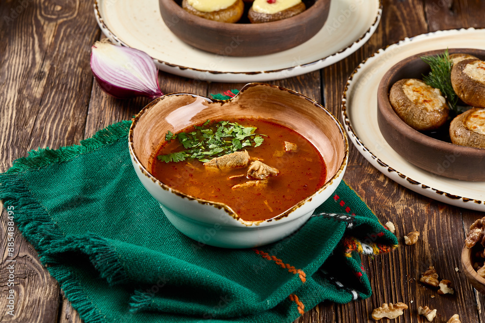 Rustic Bowl of Flavorful Soup with Herbs in Traditional Setting on Wooden Table