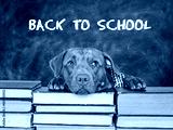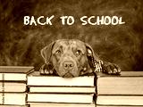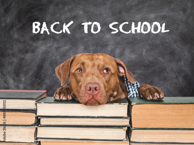Back to school. Cute puppy and blackboard with inscription. Close-up, isolated background. Studio shot, day light. Concept of care, education, obedience training and raising of pet