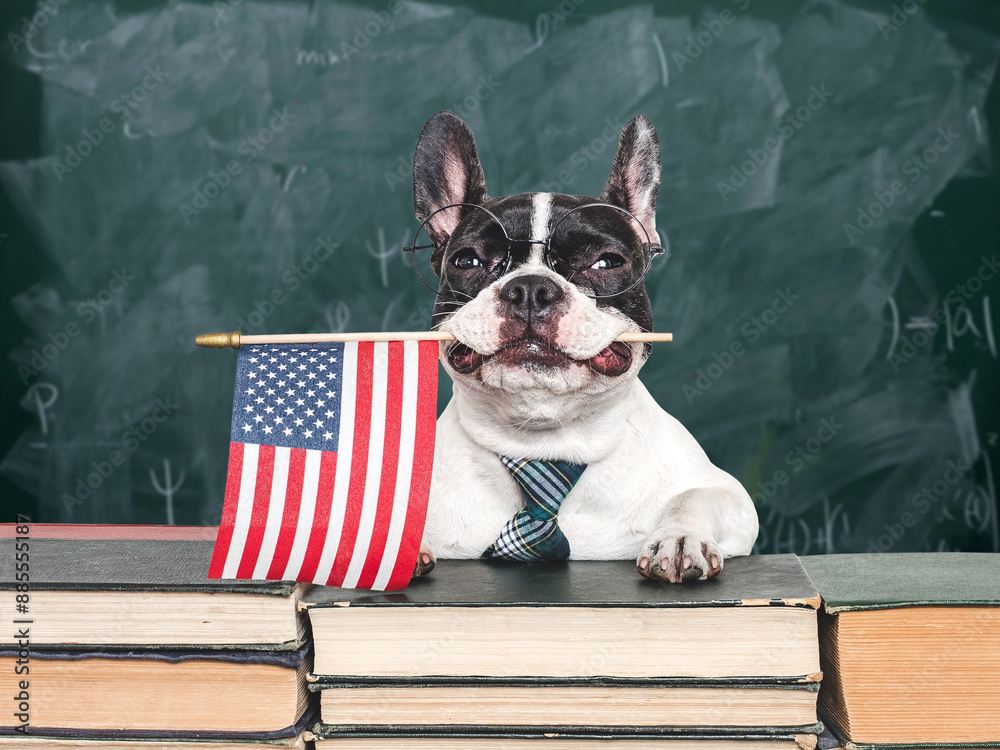 Cute puppy, old books and American Flag. Close-up, indoors, studio shot. Concept of care, education, obedience training and raising of pets