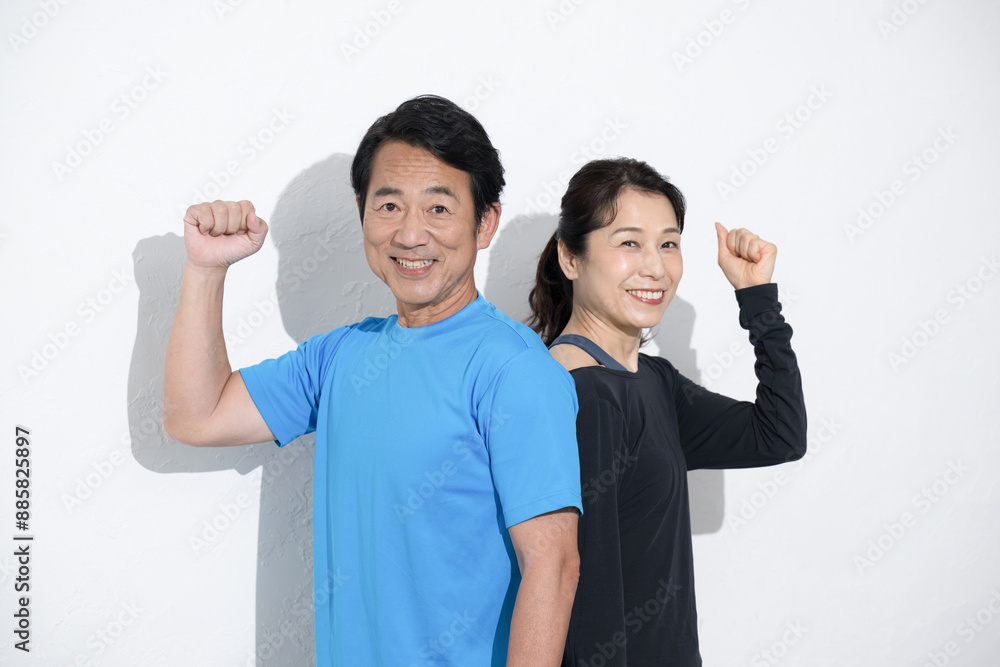 スポーツや健康などをする50代の夫婦の全身のカメラ目線 ガッツポーズのクローズアップ