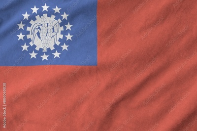 Myanmar flag depicted on folded wavy fabric of old cloth close up