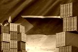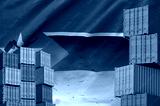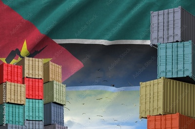 Mozambique flag and big stack of shipping cargo containers in docks with sky background close up