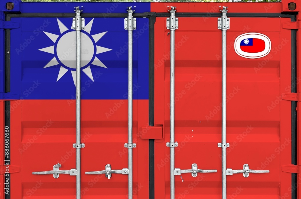 Taiwan flag depicted on metal doors of shipping cargo container outdoors in docks area close up