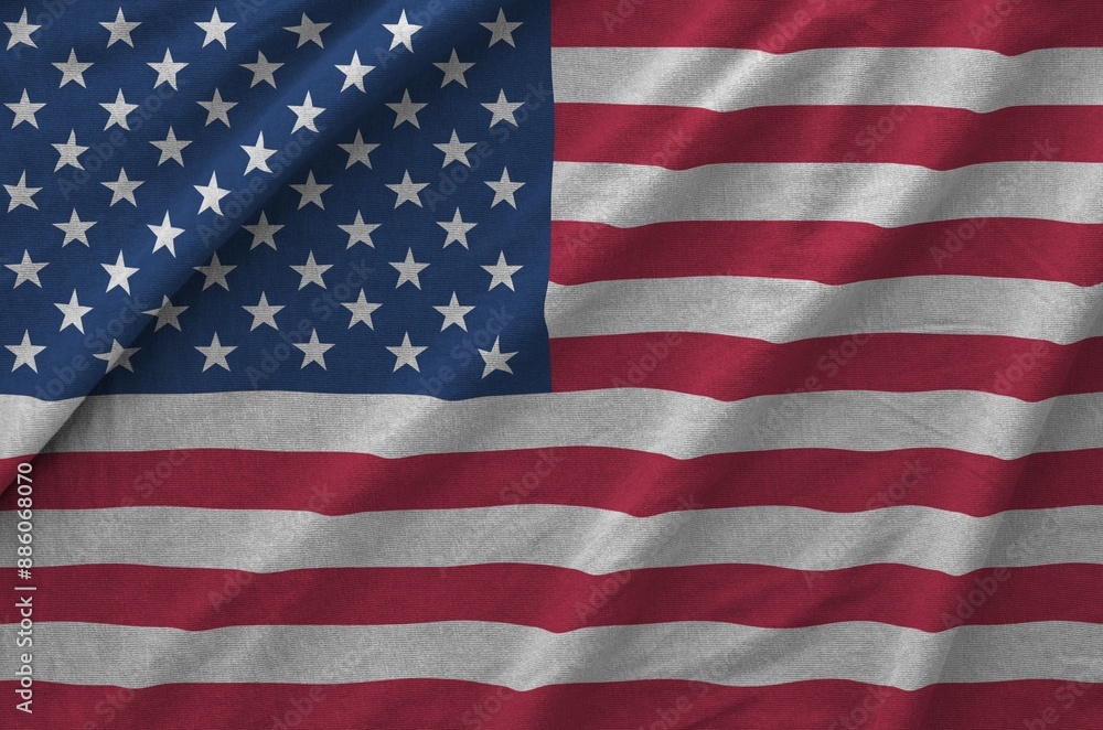 United States of America flag depicted on folded wavy fabric of old cloth close up