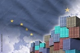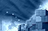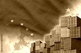 Alaska US state flag and big stack of shipping cargo containers in docks with sky background close up