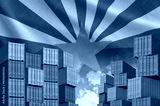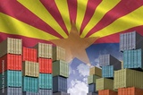 Arizaona US state flag and big stack of shipping cargo containers in docks with sky background close up