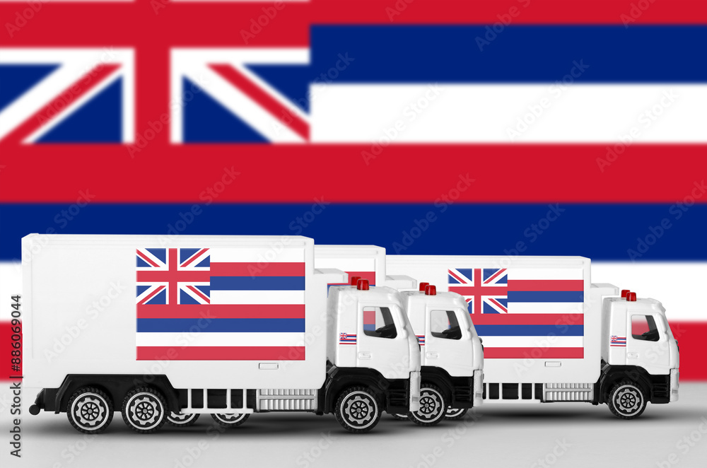 Hawaii US state flag depicted on side wall of white delivery van close up. Shipping and local delivery concept