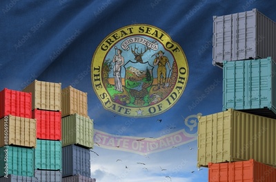 Idaho US state flag and big stack of shipping cargo containers in docks with sky background close up
