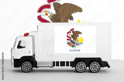 Illinois US state flag depicted on side wall of white delivery van close up. Shipping and local delivery concept