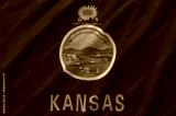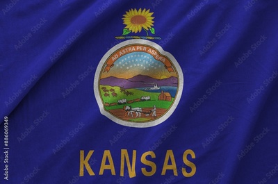 Kansas US state flag depicted on folded wavy fabric of old cloth close up