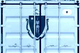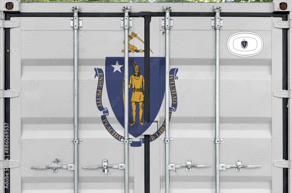 Massachusetts US state flag depicted on metal doors of shipping cargo container outdoors in docks area close up